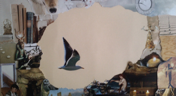 Making a collage supports me as a way of learning, increasing understanding, and deepening insight. The process is healing in itself, a coming to terms with and integrating oddities and paradoxes, an increased peace. Also, the finished piece, which I aim to be aesthetically pleasing but most of all emotionally true, becomes a power object, a reminder of my search, a solace and encouragement in times of difficulty. In this case it became an anchor through the turbulence of moving and life unfolding in different places. Through the integrity of my engagement with it and its inherent power, it may have another uncanny effect. In the last three years, where I moved from Scheveningen, to Torquay, to Yelverton, to Coventry, each time just a few weeks before I was aware of the move, something would happen to the collage. It would fall off the wall, Seagull would fall off, or the glass would break (seriously!). Was that spirit knocking at my door, signalling a time of change? Twice it happened before I got a new job; once before my house was sold. For me this strengthens and deepens my connection to other dimensions of our everyday reality.